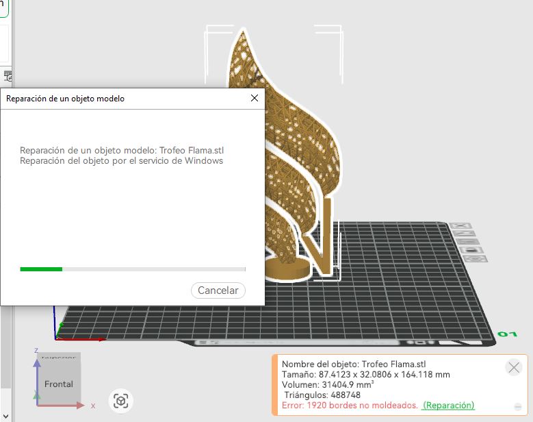 Afortunadamente, nos da la opción de reparar este error, y al momento de confirmarle, comenzara la reparación del modelo. Esto puede tardar varios minutos, dependiendo la cantidad de bordes que haya detectado.