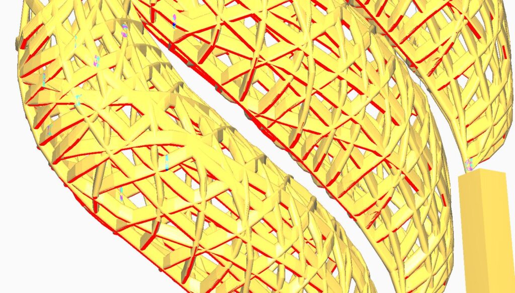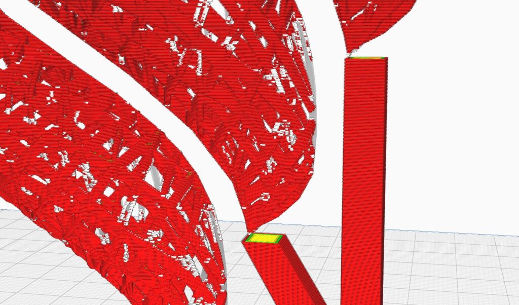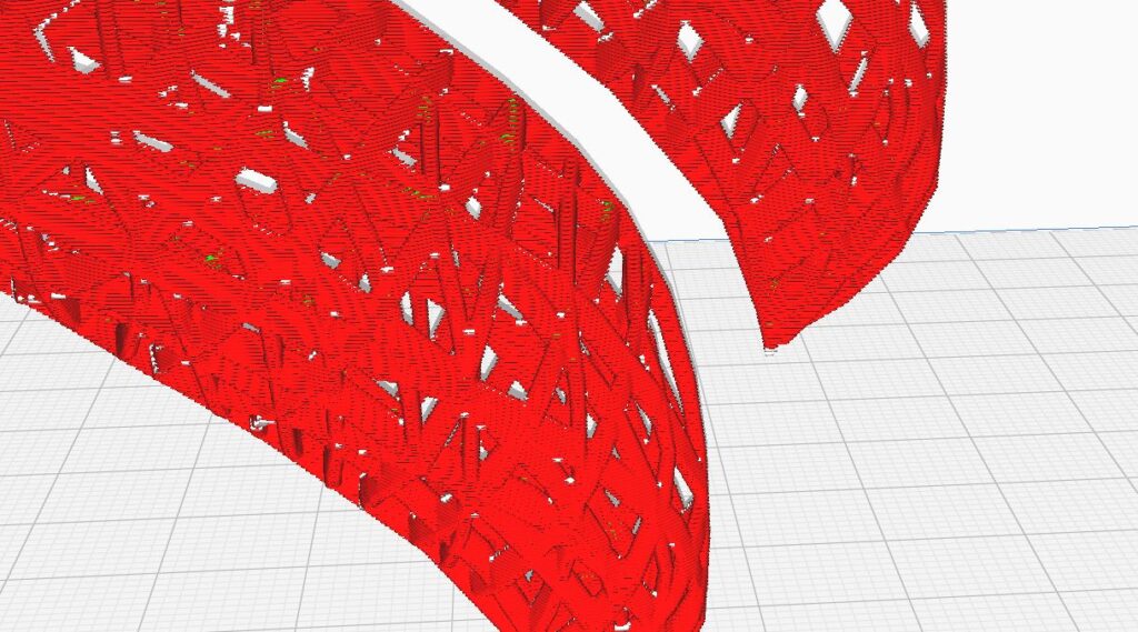 Al momento de mandar a segmentar el modelo para visualizar como se imprimiría, se podrá ver que algunas partes en blanco o que parecen haberse cortado, esto indica que dichas partes no se pueden imprimir, lo que provocaría que la pieza salga mal.